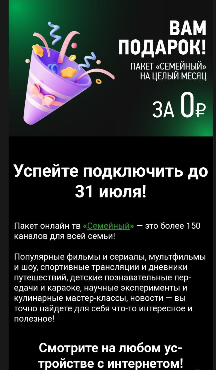 Star Family – это канал для всей семьи. В эфире – передачи, которые будут интересны как юной, так и взрослой аудитории, поэтому каждый может найти что‑то для себя. Телеканал доступен в пакете «Кино Плюс», а также в архивных пакетах «Все включено 549», «Все включено 999» и «VIP‑Кино». BOLT– телеканал для мужчин старше 25 лет, которые ценят качественные боевики, детективы и военные фильмы и сериалы. Закрученные сюжеты, яркие спецэффекты, красочные схватки, а также тематические программы о съемках, истории создания фильмов и обзоры мировых киноновинок - все это ждет вас на телеканале BOLT. Телеканал доступен в пакете «Базовый Онлайн», а также в архивных пакетах «Все включено 549», «Все включено 999», «Базовый», «Базовый Запад» и «Базовый Плюс». Star Cinema – телеканал с популярными фильмами и сериалами о любви и настоящих чувствах для женской аудитории старше 25 лет. В эфире телеканала — истории про судьбы самых разных женщин: их стремления, отношения, дружбу и борьбу с внешними обстоятельствами. Романтичные, успешные, загадочные героини, которые обязательно понравятся телезрительницам. Телеканал доступен в пакете «Базовый Онлайн», а также в архивных пакетах «Все включено 549», «Все включено 999», «Базовый», «Базовый Запад» и «Базовый Плюс». «Кино без границ» – это телеканал фильмов разных жанров, отмеченных на международных конкурсах и фестивалях. В сетке канала – киноленты с высоким рейтингом: культовое голливудское кино, премьеры мирового проката и уже любимые зрителями российские фильмы. Также на канале представлены еженедельные подборки картин по тематике, жанрам, актерам и режиссерам, что обязательно порадует настоящих ценителей качественного кино. Телеканал доступен в пакете «Базовый Онлайн», а также в архивных пакетах «Все включено 549», «Все включено 999», «Базовый», «Базовый Запад» и «Базовый Плюс». Приятного просмотра!